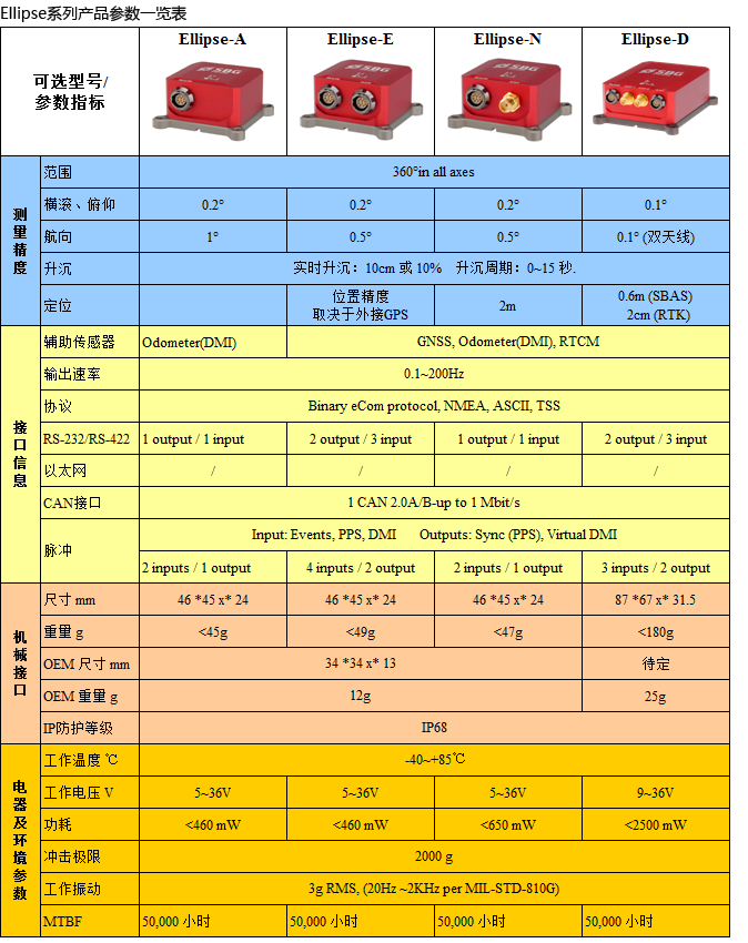 Ellipse系列介绍:Ellipse系列产品专门用来测姿,定位和定向。该系列产品采用了MEMS技术和铝合金外壳,体积小,重量轻,适合大部分航空,地面和海洋领域的应用。